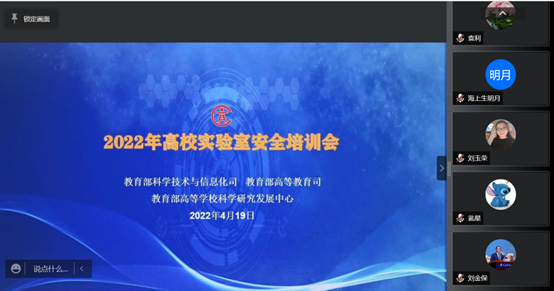 2022年4月19日上午,教育部科学技术与信息化司、高等教育司组织召开2022年实验室安全培训,我校在番禺校区行政楼422会议室设置了视频培训主会场,各学院会议室设置分会场,因疫情防控未能集中学习的老师参加线上腾讯会议学习。刘金保副校长、科研实验中心张建业主任等相关负责人及管理人员,各学院、各附属医院分管实验室安全工作的领导和实验室管理人员239人参加了培训。